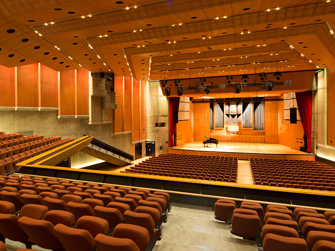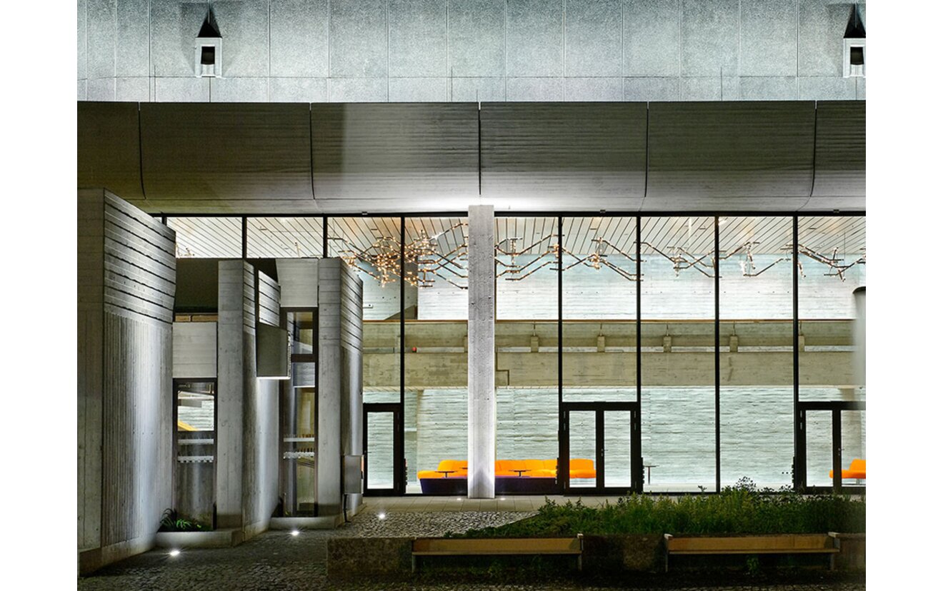 Der zentrale Gedanke des Lichtkonzeptes ergibt sich aus dem Material (Sichtbeton) und der Geometrie des Baukörpers. Die Hülle des Gebäudes bildet eine umlaufende Glashaut mit den Foyers, aus der der mächtige Block des geschlossenen Konzertsaales das Gebäude durchdringt und den oberen Abschluss bildet.