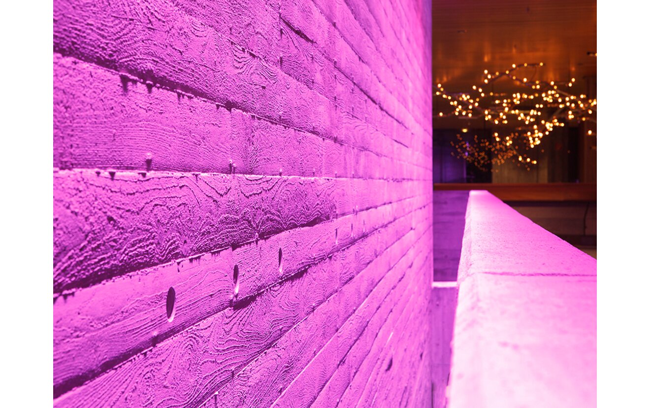 Die vertikale Betonstruktur zeigt unterschiedliche Charaktere bei Tag und bei Kunstlicht. Bei Tageslicht wird die Verschalungsstruktur des Betons hervorgehoben. Es ergeben sich unterschiedliche Tiefen-wirkungen, Porenverdichtungen und eine Graufärbung des Betons – zusammen zeigt diese Wandstruktur ein lebendiges Licht-/ und Schattenspiel.