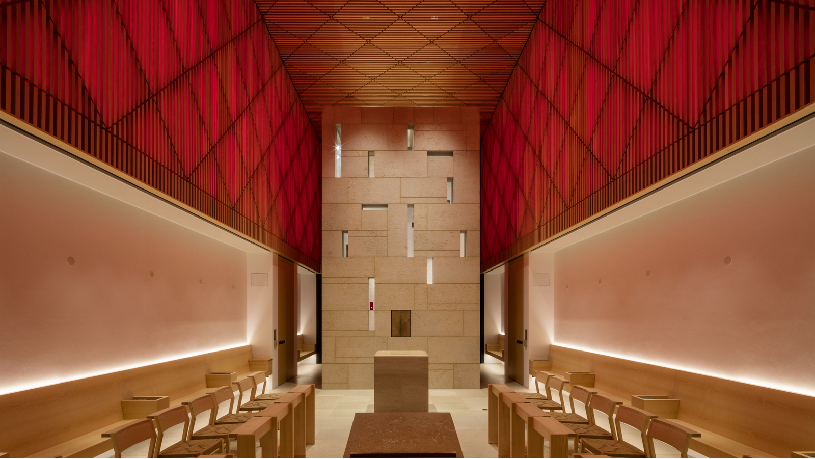 The new religious building has an assured presence, with a clearly-structured harmonious overall impression. The shell of the seemingly weightless tanslucent wooden structure is surrounded by the interplay of dynamic coloured light, giving the space a cosmic feeling of lightness.